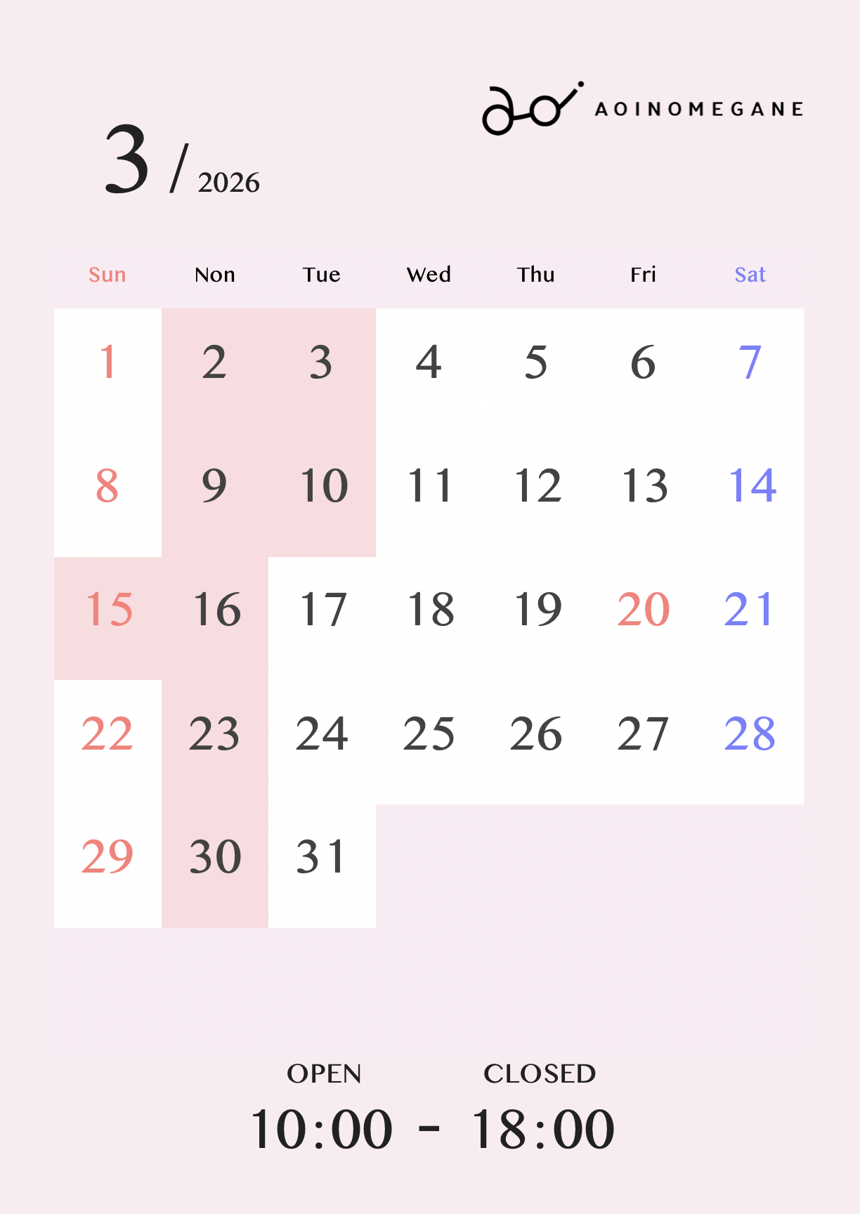 2026年3月の営業スケジュールのお知らせ | アオイノメガネ ONLINE SHOP