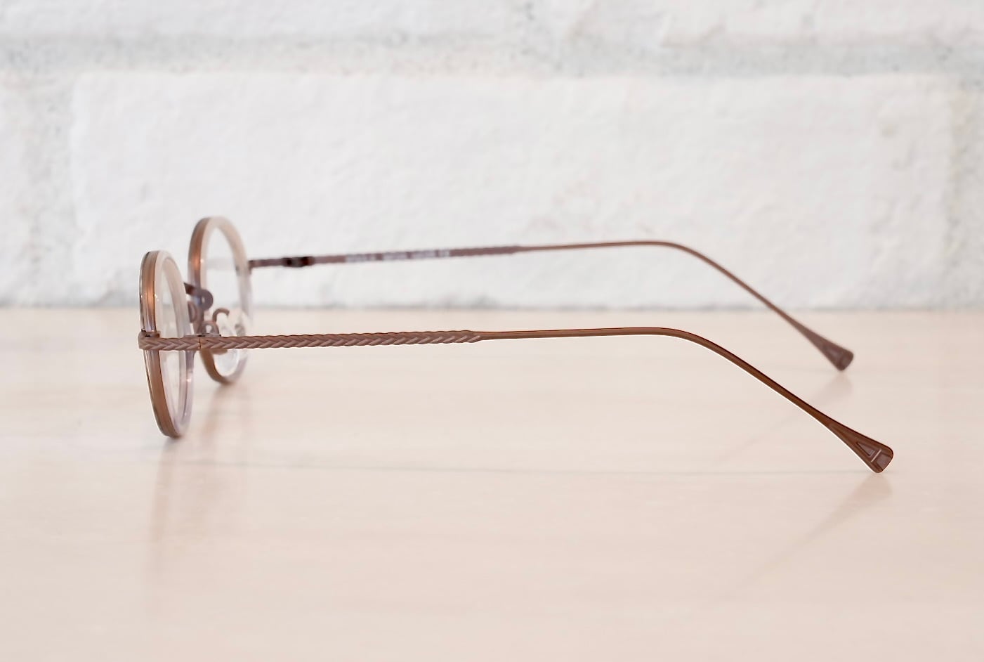 優しいオーバルシェイプのフロントに、ブリッジとテンプルには三つ編み(mitsuami)模様が施されています。